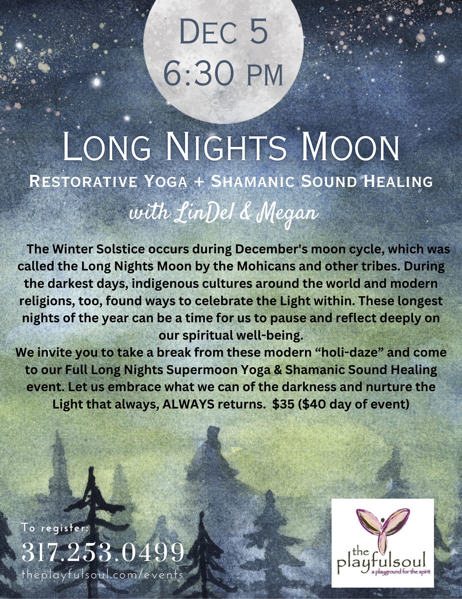| $35 – $40he moon cycle during the darkest days of Winter, was called the Long Nights Moon by the Mohicans and other groups on northern Turtle Island. Many indigenous cultures around the world and modern religions, too, find ways to celebrate the Light within the darkness. Let us use these longest nights of the year to pause and nurture our spiritual well-being.We invite you to take a break from the modern “holi-daze” and come to our Full Long Nights Supermoon Yoga & Shamanic Sound Healing event. Let us embrace what we can of the darkness and nurture the Light that always, ALWAYS returns.