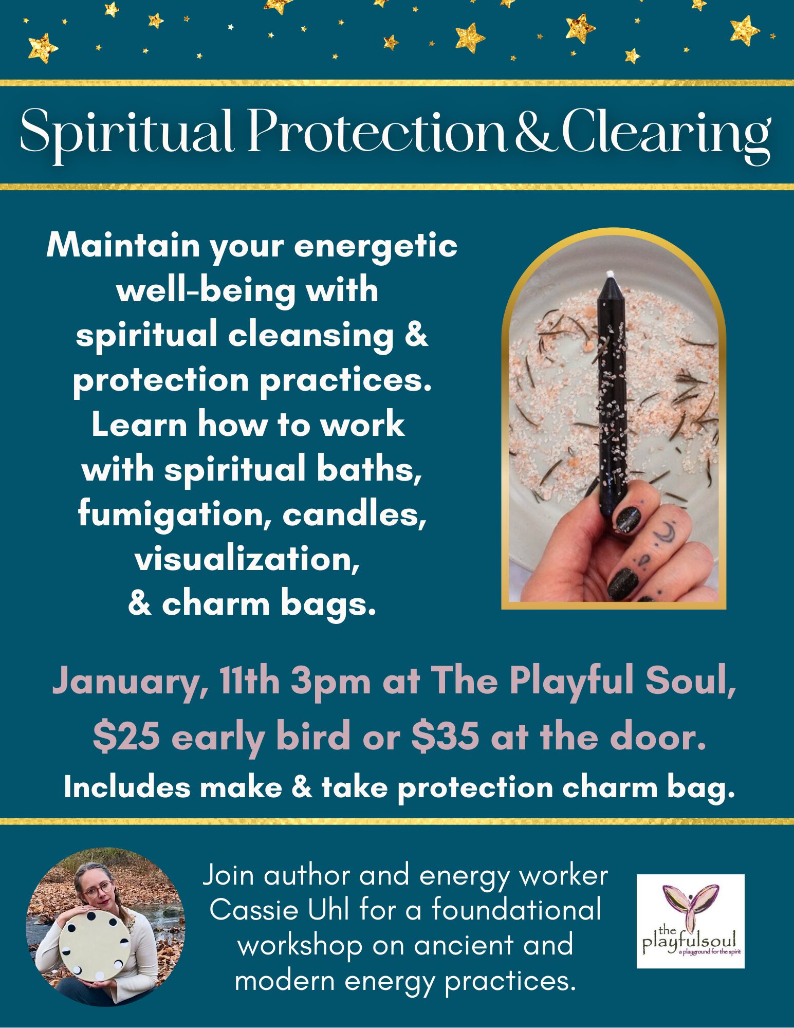 | $25 – $35Be energetically un*uckwithable! Explore ancient and modern practices to maintain your energetic well-being. You’ll learn the basics of energetic maintenance, including energetic maintenance/clearing, energetic protection practices, and why both are important. Explore how to work with spiritual baths, fumigation, candles, visualization, and & charm bags. $25 early bird or $35 at the door. Make and take energy protection charm bag included.